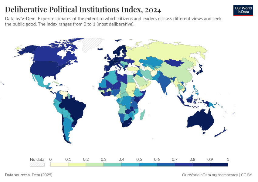 V-Dem (2025) – processed by Our World in Data. “Deliberative political institutions index – V-Dem” [dataset]. V-Dem, “Democracy report v15” [original data]. Retrieved March 5, 2026 from https://ai-search-suggested-topics-k.owid.pages.dev/grapher/deliberative-political-institutions-index
