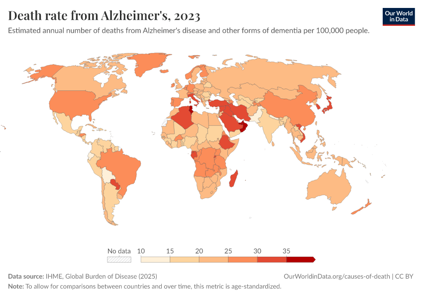 IHME, Global Burden of Disease (2025) – with major processing by Our World in Data. “Death rate from Alzheimer's” [dataset]. IHME, Global Burden of Disease, “Global Burden of Disease - Deaths” [original data]. Retrieved March 5, 2026 from https://ai-search-suggested-topics-k.owid.pages.dev/grapher/dementia-death-rates