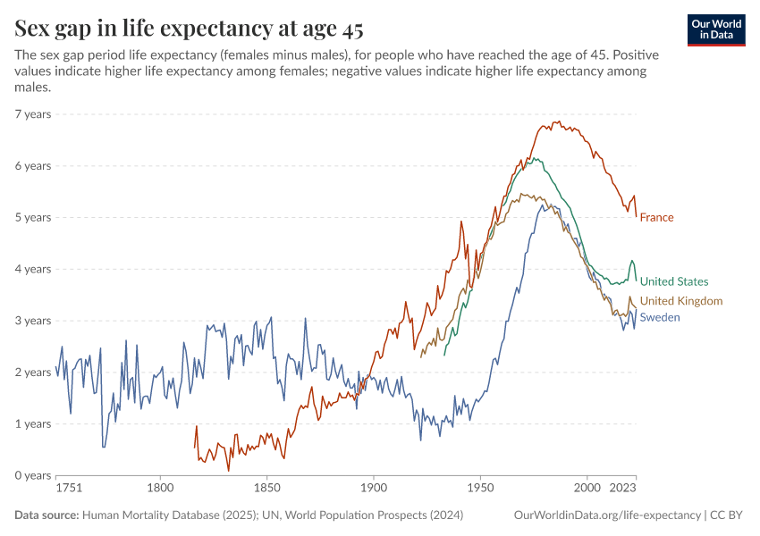 Human Mortality Database (2025); UN, World Population Prospects (2024) – with major processing by Our World in Data. “Life expectancy at 45 – HMD – female-male difference, period tables” [dataset]. Human Mortality Database, “Human Mortality Database”; United Nations, “World Population Prospects” [original data]. Retrieved March 5, 2026 from https://ai-search-suggested-topics-k.owid.pages.dev/grapher/difference-in-female-and-male-life-expectancy-at-age-45