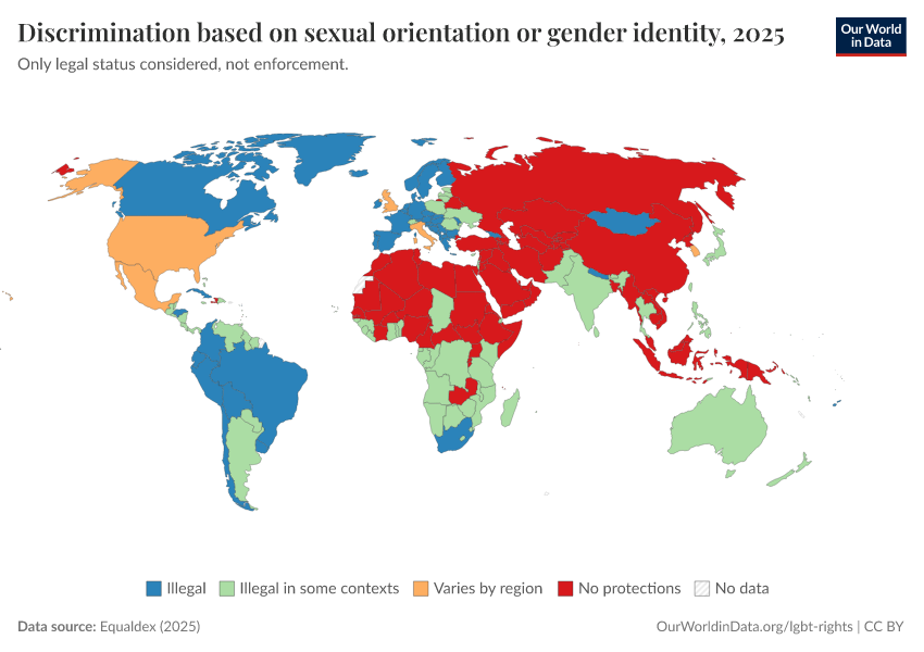 “Data Page: Discrimination based on sexual orientation or gender identity”, part of the following publication: Bastian Herre and Pablo Arriagada (2023) - “LGBT+ Rights”. Data adapted from Equaldex. Retrieved from https://ai-search-suggested-topics-k.owid.pages.dev/grapher/discrimination-lgbt-equaldex [online resource]How to cite this data
