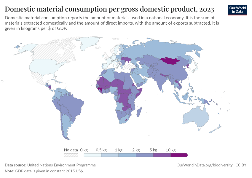 United Nations Environment Programme – processed by Our World in Data. “Domestic material consumption per gross domestic product” [dataset]. United Nations Environment Programme, “WESR / Global Material Flows Database” [original data]. Retrieved March 5, 2026 from https://ai-search-suggested-topics-k.owid.pages.dev/grapher/domestic-material-consumption-per-unit-of-gdp