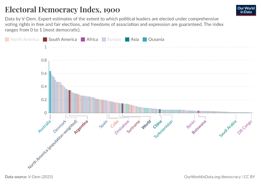 “Data Page: Electoral democracy index”, part of the following publication: Bastian Herre, Lucas Rodés-Guirao, and Esteban Ortiz-Ospina (2013) - “Democracy”. Data adapted from V-Dem. Retrieved from https://ai-search-suggested-topics-k.owid.pages.dev/grapher/electoral-democracy-index [online resource]How to cite this data