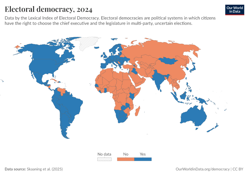 Skaaning et al. (2025) – processed by Our World in Data. “Electoral democracy” [dataset]. Skaaning et al., “Lexical Index of Electoral Democracy (LIED) v6.8” [original data]. Retrieved March 5, 2026 from https://ai-search-suggested-topics-k.owid.pages.dev/grapher/electoral-democracy-lexical