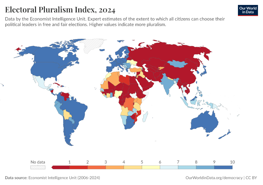 Economist Intelligence Unit (2006-2024) – processed by Our World in Data. “Electoral Pluralism Index” [dataset]. Economist Intelligence Unit, “Democracy Index 2021: The China challenge”; Economist Intelligence Unit, “Democracy Index 2022: Frontline democracy and the battle for Ukraine”; Economist Intelligence Unit, “Democracy Index 2023: Age of Conflict”; Economist Intelligence Unit, “Democracy Index 2024: What's wrong with representative democracy?”; Gapminder, “Democracy Index v4”; Various sources, “Population” [original data]. Retrieved March 5, 2026 from https://ai-search-suggested-topics-k.owid.pages.dev/grapher/electoral-pluralism-index-eiu