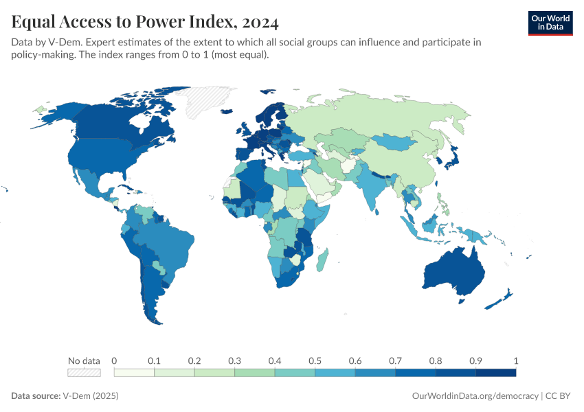 V-Dem (2025) – processed by Our World in Data. “Equal access to power index – V-Dem” [dataset]. V-Dem, “Democracy report v15” [original data]. Retrieved March 5, 2026 from https://ai-search-suggested-topics-k.owid.pages.dev/grapher/equal-access-to-power-index