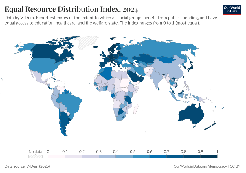 V-Dem (2025) – processed by Our World in Data. “Equal resource distribution index – V-Dem” [dataset]. V-Dem, “Democracy report v15” [original data]. Retrieved March 5, 2026 from https://ai-search-suggested-topics-k.owid.pages.dev/grapher/equal-resource-distribution-index