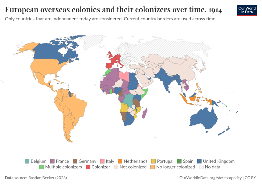 “Data Page: European overseas colonies and their colonizers over time”, part of the following publication: Bastian Herre and Pablo Arriagada (2023) - “State Capacity”. Data adapted from Bastian Becker. Retrieved from https://ai-search-suggested-topics-k.owid.pages.dev/grapher/european-overseas-colonies-and-their-colonizers [online resource]How to cite this data