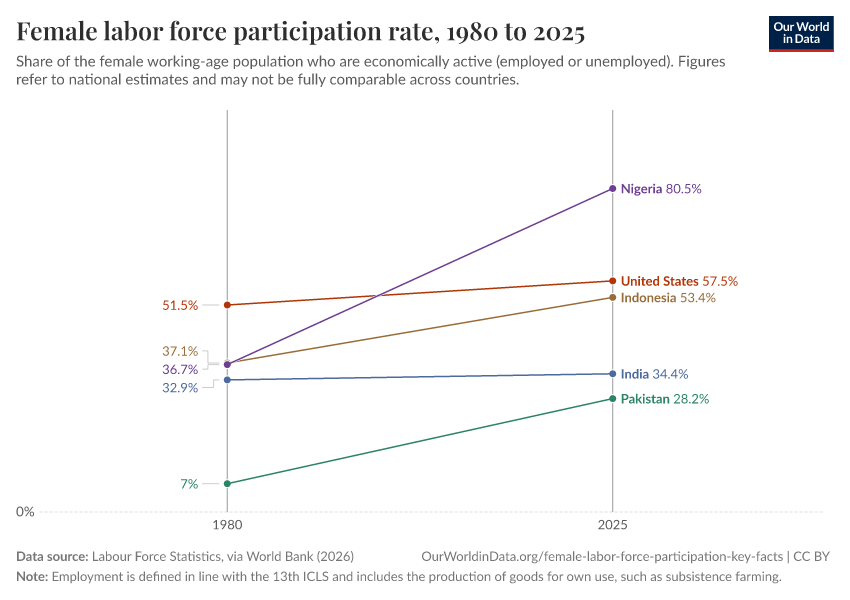 Labour Force Statistics, via World Bank (2026) – processed by Our World in Data. “Female labor force participation rate – ILO” [dataset]. Labour Force Statistics, via World Bank, “World Development Indicators 125” [original data]. Retrieved March 5, 2026 from https://ai-search-suggested-topics-k.owid.pages.dev/grapher/female-labor-force-participation-rates-slopes