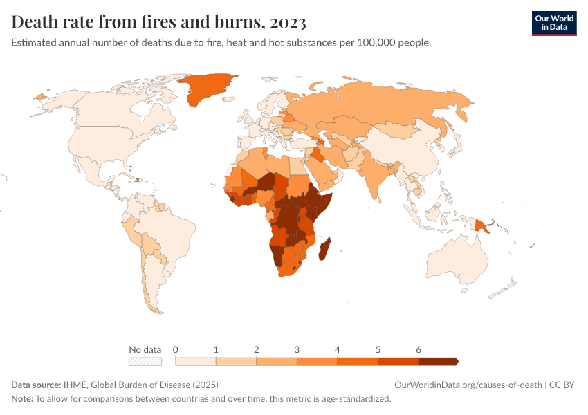 IHME, Global Burden of Disease (2025) – with major processing by Our World in Data. “Death rate from fires and burns” [dataset]. IHME, Global Burden of Disease, “Global Burden of Disease - Deaths” [original data]. Retrieved March 5, 2026 from https://ai-search-suggested-topics-k.owid.pages.dev/grapher/fire-death-rates