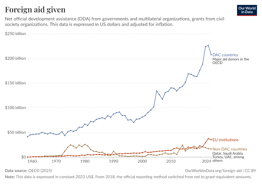OECD (2025) – with major processing by Our World in Data. “Foreign aid given – Net disbursements” [dataset]. OECD, “OECD Official Development Assistance (ODA) - DAC1: Flows by provider (ODA+OOF+Private)”; OECD, “OECD Official Development Assistance (ODA) - DAC2A: Aid (ODA) disbursements to countries and regions” [original data]. Retrieved March 5, 2026 from https://ai-search-suggested-topics-k.owid.pages.dev/grapher/foreign-aid-given-net