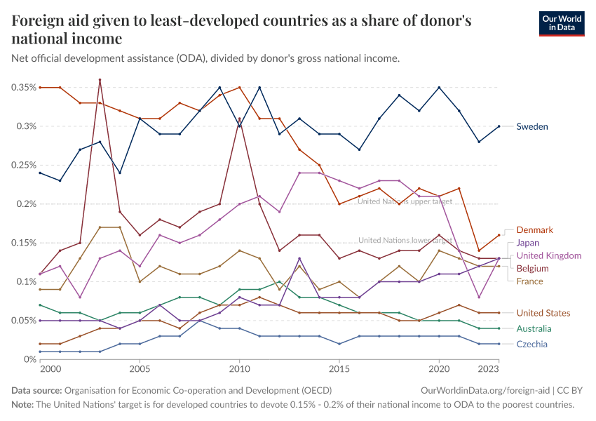 “Data Page: Foreign aid given to least-developed countries as a share of donor's national income”. Our World in Data (2026). Data adapted from Organisation for Economic Co-operation and Development. Retrieved from https://ai-search-suggested-topics-k.owid.pages.dev/grapher/foreign-aid-given-to-least-developed-countries-as-a-share-of-donors-national-income [online resource]How to cite this data