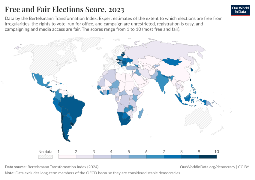 Bertelsmann Transformation Index (2024) – processed by Our World in Data. “Free and Fair Elections Score” [dataset]. Bertelsmann Transformation Index, “Bertelsmann Transformation Index, Scores” [original data]. Retrieved March 5, 2026 from https://ai-search-suggested-topics-k.owid.pages.dev/grapher/free-fair-elections-bti