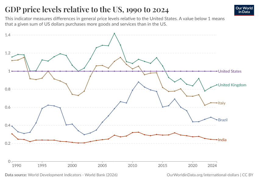 “Data Page: GDP price levels relative to the US”, part of the following publication: Max Roser, Bertha Rohenkohl, Pablo Arriagada, Joe Hasell, Hannah Ritchie, and Esteban Ortiz-Ospina (2023) - “Economic Growth”. Data adapted from World Development Indicators - World Bank. Retrieved from https://ai-search-suggested-topics-k.owid.pages.dev/grapher/gdp-price-levels-relative-to-the-us [online resource]How to cite this data