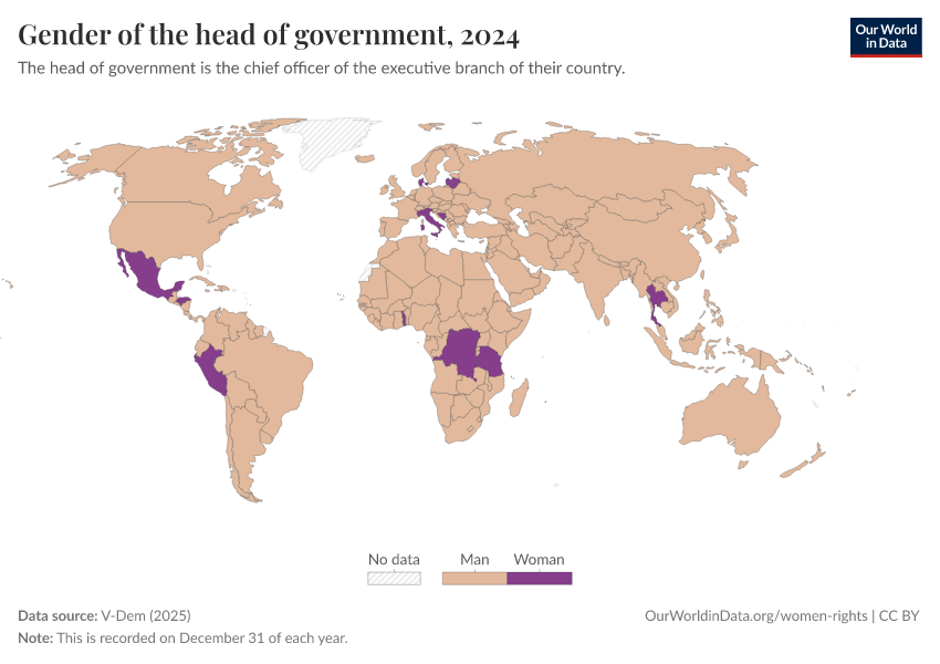 V-Dem (2025) – processed by Our World in Data. “Gender of the head of government” [dataset]. V-Dem, “Democracy report v15” [original data]. Retrieved March 5, 2026 from https://ai-search-suggested-topics-k.owid.pages.dev/grapher/gender-of-the-head-of-government