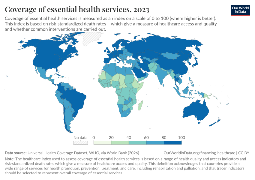 “Data Page: Coverage of essential health services”. Our World in Data (2026). Data adapted from Universal Health Coverage Dataset, WHO, via World Bank. Retrieved from https://ai-search-suggested-topics-k.owid.pages.dev/grapher/healthcare-access-quality-un [online resource]How to cite this data