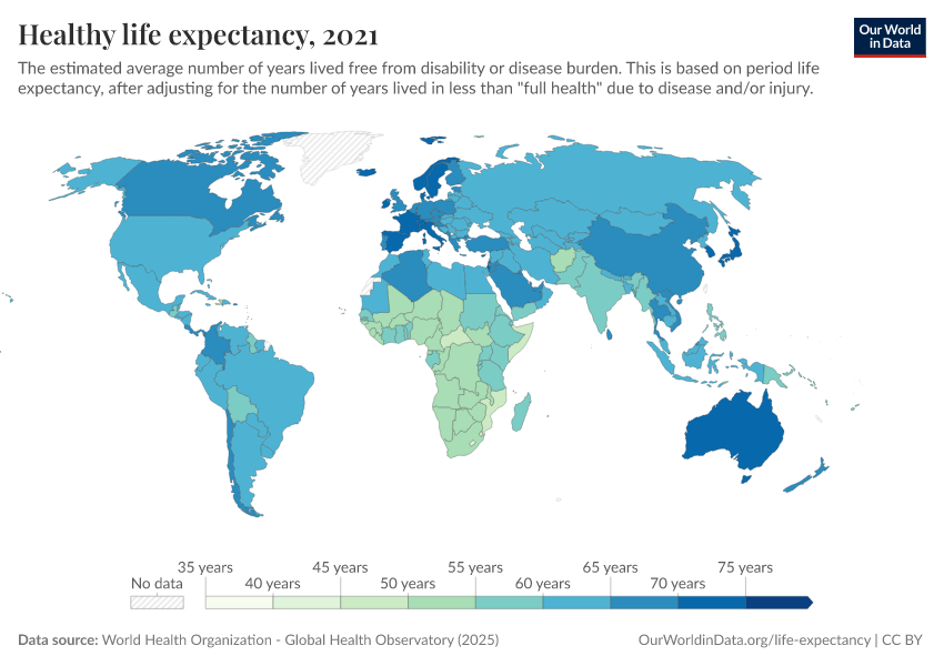 “Data Page: Healthy life expectancy”. Our World in Data (2026). Data adapted from World Health Organization. Retrieved from https://ai-search-suggested-topics-k.owid.pages.dev/grapher/healthy-life-expectancy-at-birth [online resource]How to cite this data