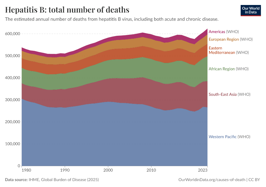 IHME, Global Burden of Disease (2025) – with major processing by Our World in Data. “Hepatitis B: total number of deaths” [dataset]. IHME, Global Burden of Disease, “Global Burden of Disease - Deaths” [original data]. Retrieved March 5, 2026 from https://ai-search-suggested-topics-k.owid.pages.dev/grapher/hepatitis-b-number-of-deaths