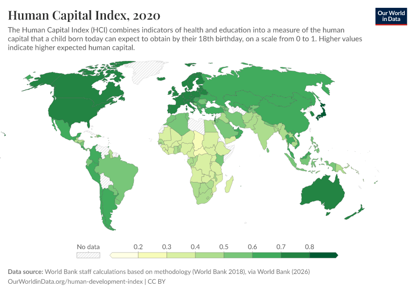 “Data Page: Human Capital Index”. Our World in Data (2026). Data adapted from World Bank staff calculations based on methodology (World Bank 2018), via World Bank. Retrieved from https://ai-search-suggested-topics-k.owid.pages.dev/grapher/human-capital-index-in-2018 [online resource]How to cite this data