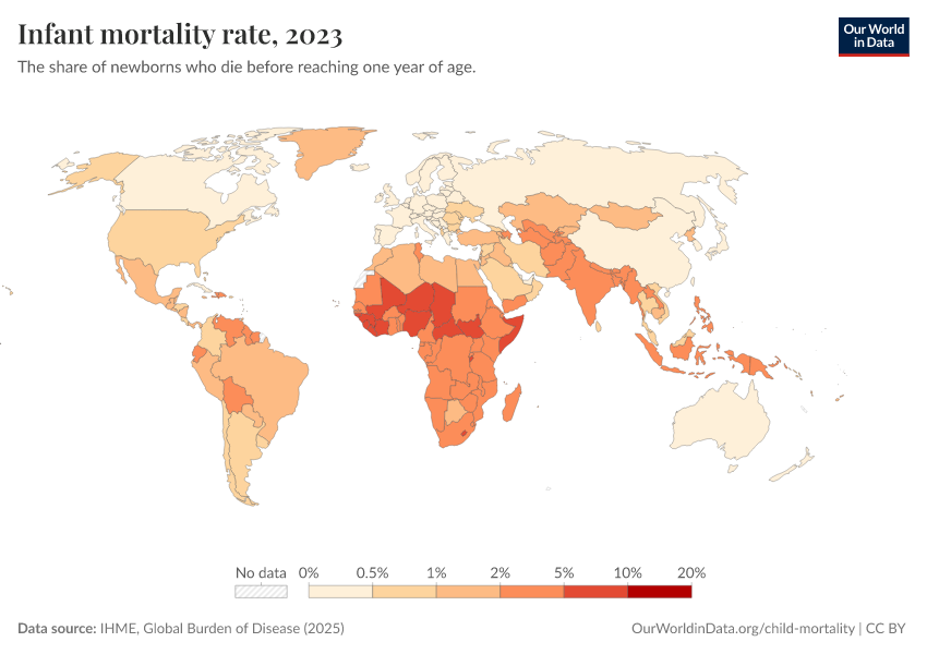 IHME, Global Burden of Disease (2025) – with minor processing by Our World in Data. “Infant mortality rate” [dataset]. IHME, Global Burden of Disease, “Global Burden of Disease - Child Mortality” [original data]. Retrieved March 5, 2026 from https://ai-search-suggested-topics-k.owid.pages.dev/grapher/infant-mortality-rate