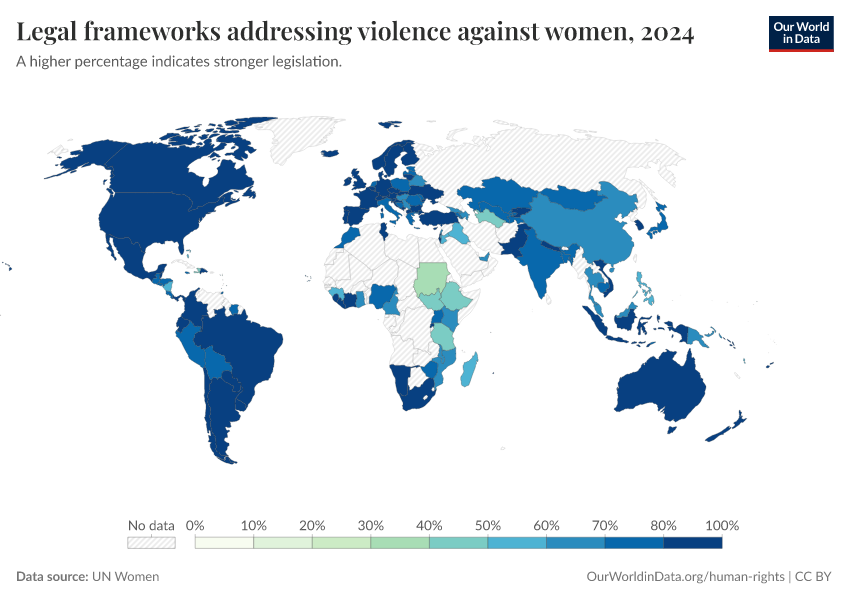 “Data Page: Legal frameworks addressing violence against women”. Our World in Data (2026). Data adapted from UN Women. Retrieved from https://ai-search-suggested-topics-k.owid.pages.dev/grapher/legal-frameworks-regarding-violence-against-women [online resource]How to cite this data