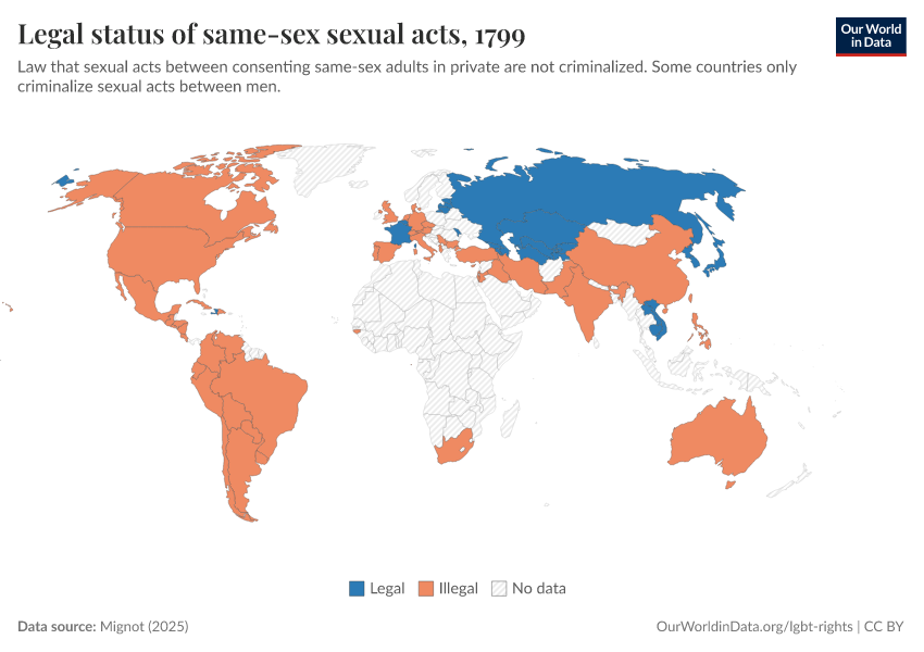 “Data Page: Legal status of same-sex sexual acts”, part of the following publication: Bastian Herre and Pablo Arriagada (2023) - “LGBT+ Rights”. Data adapted from Mignot. Retrieved from https://ai-search-suggested-topics-k.owid.pages.dev/grapher/legal-status-of-same-sex-sexual-acts [online resource]How to cite this data