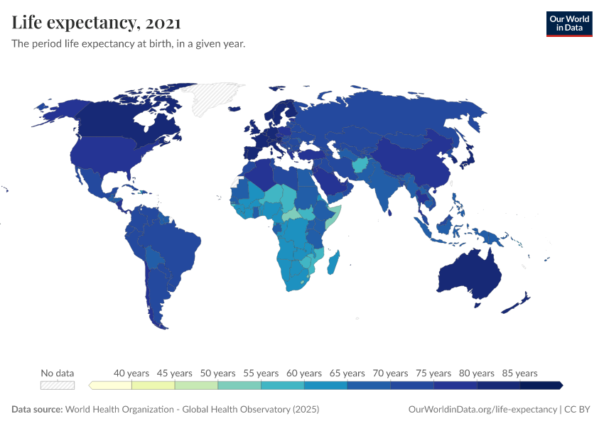 “Data Page: Life expectancy”. Our World in Data (2026). Data adapted from World Health Organization. Retrieved from https://ai-search-suggested-topics-k.owid.pages.dev/grapher/life-expectancy-at-birth-who-gho [online resource]How to cite this data