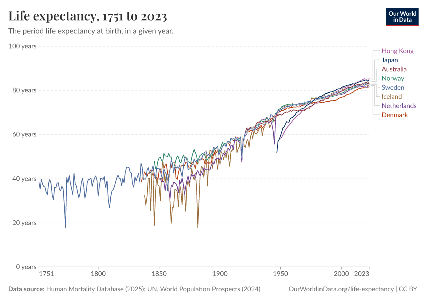 “Data Page: Life expectancy at birth”, part of the following publication: Saloni Dattani, Lucas Rodés-Guirao, Hannah Ritchie, Esteban Ortiz-Ospina, and Max Roser (2023) - “Life Expectancy”. Data adapted from Human Mortality Database, United Nations. Retrieved from https://ai-search-suggested-topics-k.owid.pages.dev/grapher/life-expectancy-hmd-unwpp [online resource]How to cite this data