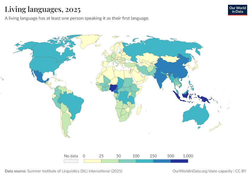“Data Page: Living languages”, part of the following publication: Bastian Herre and Pablo Arriagada (2023) - “State Capacity”. Data adapted from Summer Institute of Linguistics (SIL) International. Retrieved from https://ai-search-suggested-topics-k.owid.pages.dev/grapher/living-languages [online resource]How to cite this data
