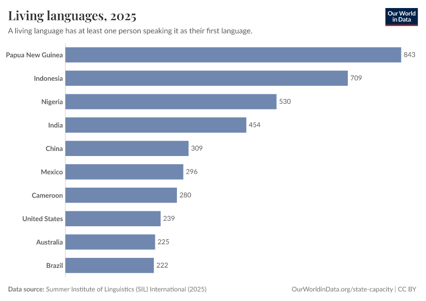 “Data Page: Living languages”, part of the following publication: Bastian Herre and Pablo Arriagada (2023) - “State Capacity”. Data adapted from Summer Institute of Linguistics (SIL) International. Retrieved from https://ai-search-suggested-topics-k.owid.pages.dev/grapher/living-languages [online resource]How to cite this data