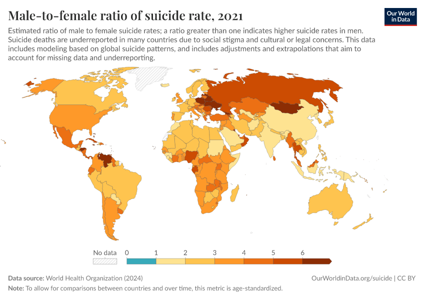 World Health Organization (2024) – with major processing by Our World in Data. “Male-to-female ratio of suicide rate” [dataset]. World Health Organization, “Global Health Estimates” [original data]. Retrieved March 5, 2026 from https://ai-search-suggested-topics-k.owid.pages.dev/grapher/male-female-ratio-suicides-rates