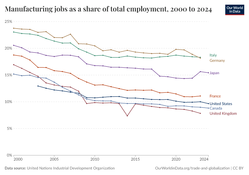 “Data Page: Manufacturing jobs as a share of total employment”. Our World in Data (2026). Data adapted from United Nations Industrial Development Organization. Retrieved from https://ai-search-suggested-topics-k.owid.pages.dev/grapher/manufacturing-share-of-total-employment [online resource]How to cite this data