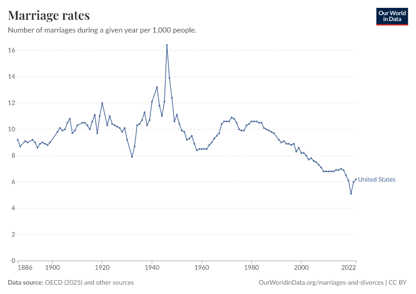Marriage rates in the United States between 1886 and 1945 are sourced from the US Census, for years 1945 to 1990 they are sourced from the CDC. Recent data comes from OECD.