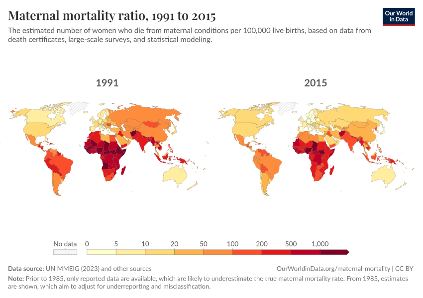 “Data Page: Maternal mortality ratio”, part of the following publication: Max Roser and Hannah Ritchie (2013) - “Maternal Mortality”. Data adapted from UN MMEIG (WHO, UNICEF, UNFPA, World Bank Group and UNDESA/ Population Division), WHO Mortality Database, United Nations, Gapminder. Retrieved from https://ai-search-suggested-topics-k.owid.pages.dev/grapher/maternal-mortality [online resource]How to cite this data