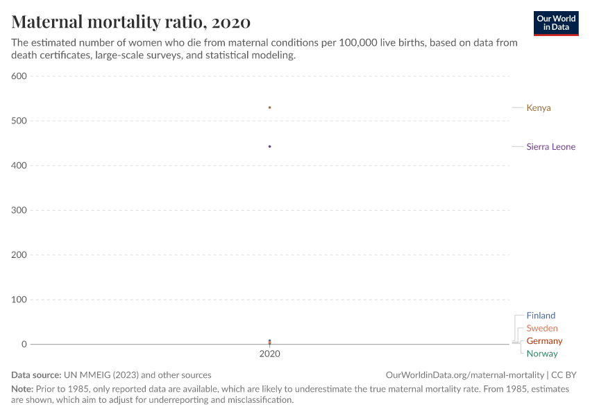 “Data Page: Maternal mortality ratio”, part of the following publication: Max Roser and Hannah Ritchie (2013) - “Maternal Mortality”. Data adapted from UN MMEIG (WHO, UNICEF, UNFPA, World Bank Group and UNDESA/ Population Division), WHO Mortality Database, United Nations, Gapminder. Retrieved from https://ai-search-suggested-topics-k.owid.pages.dev/grapher/maternal-mortality [online resource]How to cite this data