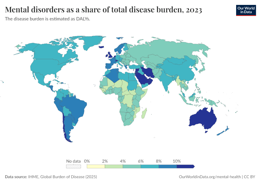IHME, Global Burden of Disease (2025) – with major processing by Our World in Data. “Mental disorders as a share of total disease burden” [dataset]. IHME, Global Burden of Disease, “Global Burden of Disease - DALYs” [original data]. Retrieved March 5, 2026 from https://ai-search-suggested-topics-k.owid.pages.dev/grapher/mental-and-substance-use-as-share-of-disease