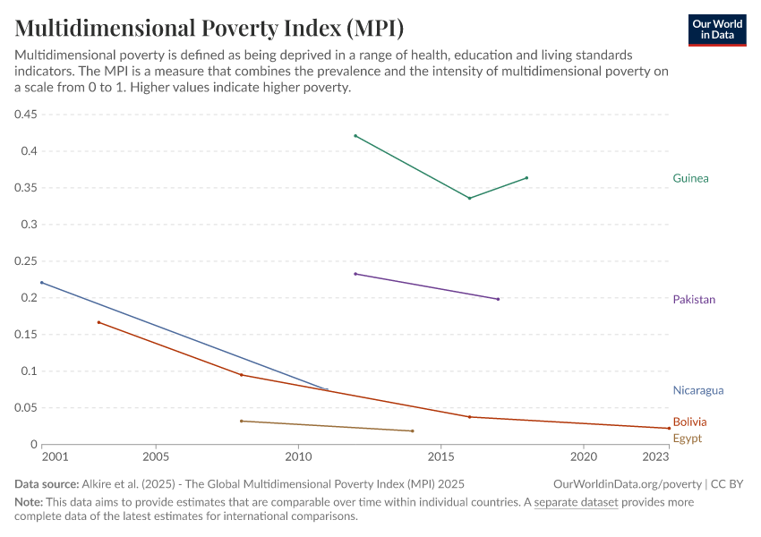 Alkire et al. (2025) - The Global Multidimensional Poverty Index (MPI) 2025 – with minor processing by Our World in Data. “Multidimensional Poverty Index (MPI) – Harmonized over time” [dataset]. Alkire et al., “Global Multidimensional Poverty Index (MPI) 2025” [original data]. Retrieved March 5, 2026 from https://ai-search-suggested-topics-k.owid.pages.dev/grapher/multidimensional-poverty-index-mpi-hot