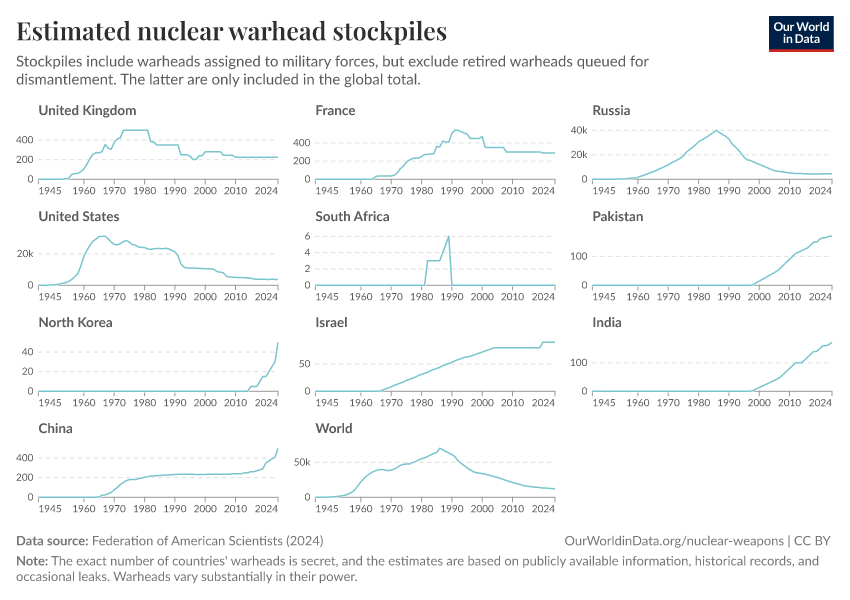 Federation of American Scientists (2024) – with minor processing by Our World in Data. “Estimated nuclear warhead stockpiles” [dataset]. Federation of American Scientists, “Estimated Global Nuclear Warhead Inventories” [original data]. Retrieved March 5, 2026 from https://ai-search-suggested-topics-k.owid.pages.dev/grapher/nuclear-warhead-stockpiles-lines