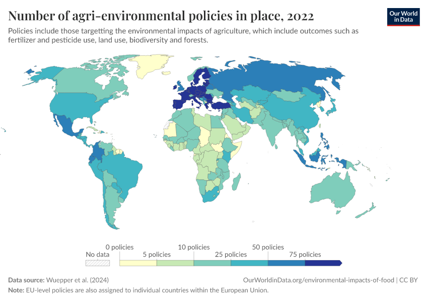 “Data Page: Number of agri-environmental policies in place”. Our World in Data (2026). Data adapted from Wuepper et al. (2024). Retrieved from https://ai-search-suggested-topics-k.owid.pages.dev/grapher/number-agri-environmental-policies [online resource]How to cite this data