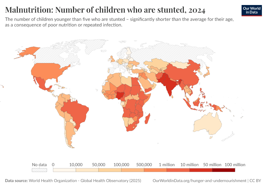 “Data Page: Malnutrition: Number of children who are stunted”. Our World in Data (2026). Data adapted from World Health Organization. Retrieved from https://ai-search-suggested-topics-k.owid.pages.dev/grapher/number-children-stunted-who [online resource]How to cite this data