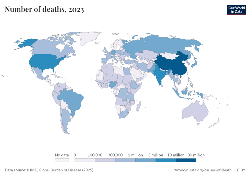 IHME, Global Burden of Disease (2025) – with major processing by Our World in Data. “Number of deaths” [dataset]. IHME, Global Burden of Disease, “Global Burden of Disease - Deaths” [original data]. Retrieved March 5, 2026 from https://ai-search-suggested-topics-k.owid.pages.dev/grapher/number-of-deaths-gbd