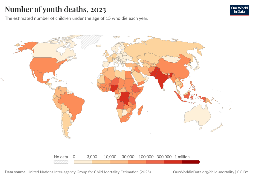 United Nations Inter-agency Group for Child Mortality Estimation (2025) – with minor processing by Our World in Data. “Under-fifteen deaths” [dataset]. United Nations Inter-agency Group for Child Mortality Estimation, “United Nations Inter-agency Group for Child Mortality Estimation”; UN Inter-agency Group for Child Mortality Estimation, “Child Mortality Estimates 2018”; Various sources, “Population” [original data]. Retrieved March 5, 2026 from https://ai-search-suggested-topics-k.owid.pages.dev/grapher/number-of-youth-deaths