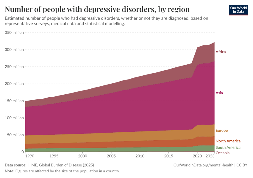 IHME, Global Burden of Disease (2025) – with major processing by Our World in Data. “Number of people with depressive disorders, by region” [dataset]. IHME, Global Burden of Disease, “Global Burden of Disease - Mental Health Prevalence” [original data]. Retrieved March 5, 2026 from https://ai-search-suggested-topics-k.owid.pages.dev/grapher/number-suffering-from-depression-by-region