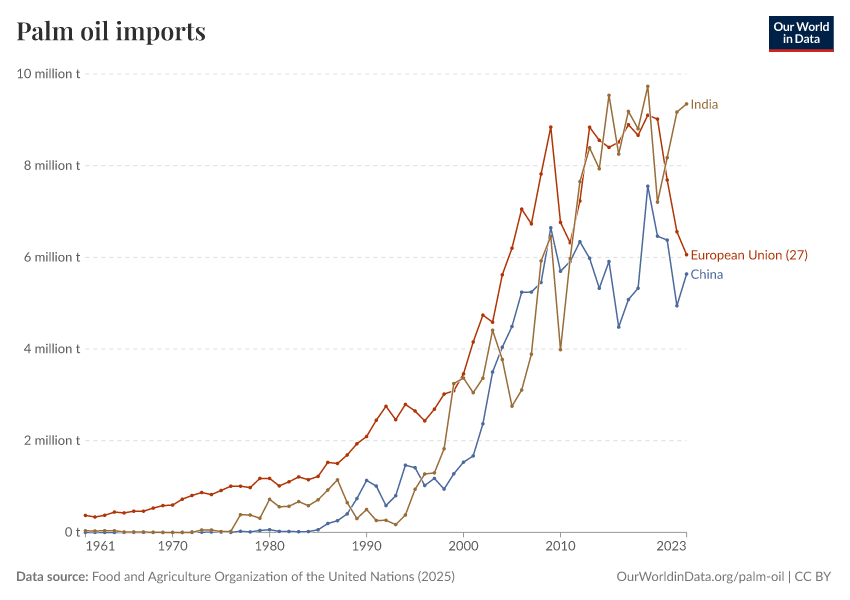 “Data Page: Imports of palm oil”. Our World in Data (2026). Data adapted from Food and Agriculture Organization of the United Nations. Retrieved from https://ai-search-suggested-topics-k.owid.pages.dev/grapher/palm-oil-imports [online resource]