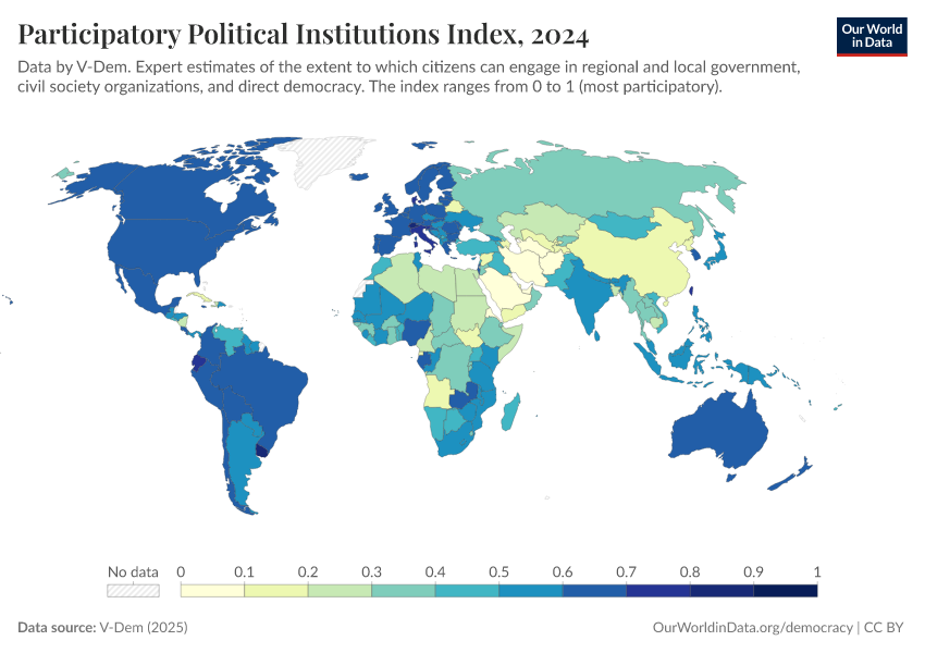 “Data Page: Participatory political institutions”, part of the following publication: Bastian Herre, Lucas Rodés-Guirao, and Esteban Ortiz-Ospina (2013) - “Democracy”. Data adapted from V-Dem. Retrieved from https://ai-search-suggested-topics-k.owid.pages.dev/grapher/participatory-political-institutions-index [online resource]How to cite this data