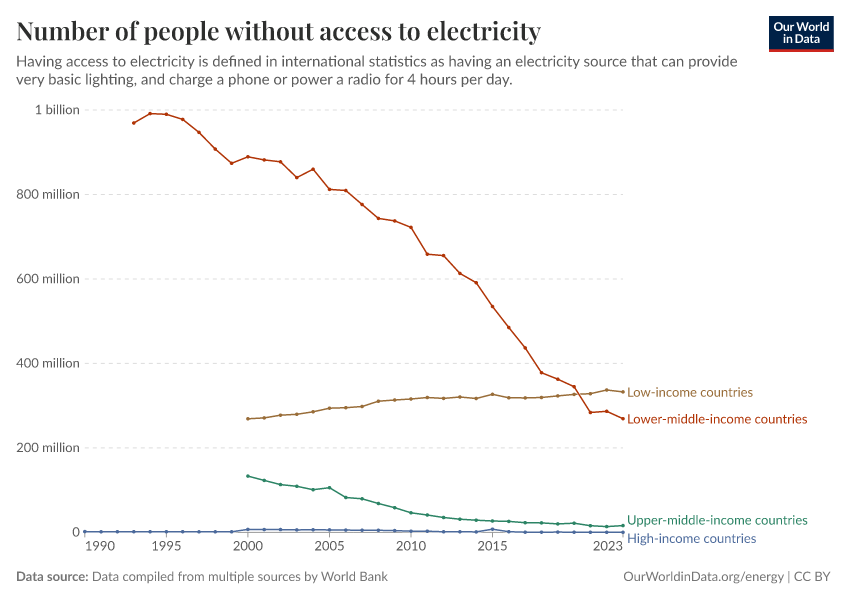 Data compiled from multiple sources by World Bank – with major processing by Our World in Data. “Number of people without access to electricity – World Bank” [dataset]. SDG 7.1.1 Electrification Dataset, World Bank, via World Bank, “World Development Indicators 125”; United Nations Population Division, national statistical offices, and Eurostat, via World Bank, “World Development Indicators 125” [original data]. Retrieved March 5, 2026 from https://ai-search-suggested-topics-k.owid.pages.dev/grapher/people-without-electricity-country