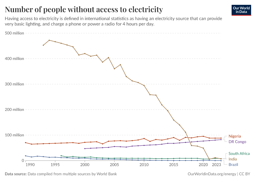 Data compiled from multiple sources by World Bank – with major processing by Our World in Data. “Number of people without access to electricity – World Bank” [dataset]. SDG 7.1.1 Electrification Dataset, World Bank, via World Bank, “World Development Indicators 125”; United Nations Population Division, national statistical offices, and Eurostat, via World Bank, “World Development Indicators 125” [original data]. Retrieved March 5, 2026 from https://ai-search-suggested-topics-k.owid.pages.dev/grapher/people-without-electricity-country