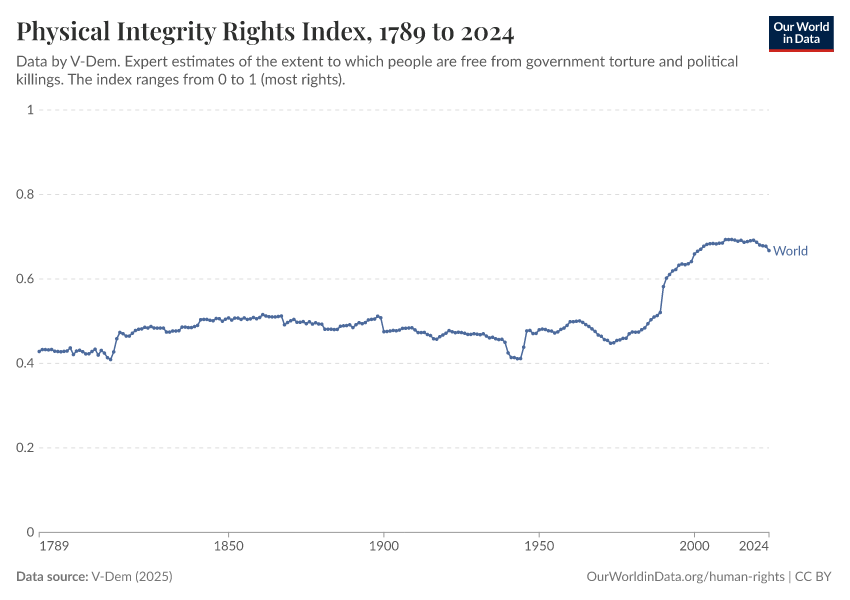 “Data Page: Physical violence index”, part of the following publication: Bastian Herre, Lucas Rodés-Guirao, and Esteban Ortiz-Ospina (2013) - “Democracy”. Data adapted from V-Dem. Retrieved from https://ai-search-suggested-topics-k.owid.pages.dev/grapher/physical-integrity-rights-index-vdem [online resource]How to cite this data