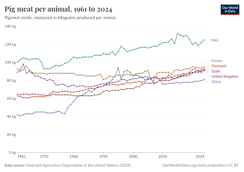 “Data Page: Pig meat yield per animal”, part of the following publication: Hannah Ritchie, Pablo Rosado, and Max Roser (2023) - “Agricultural Production”. Data adapted from Food and Agriculture Organization of the United Nations. Retrieved from https://ai-search-suggested-topics-k.owid.pages.dev/grapher/pig-yields-meat-per-animal-in-hectograms-100-grams [online resource]How to cite this data