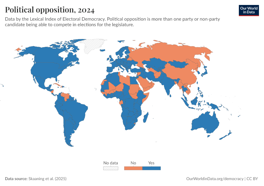 Skaaning et al. (2025) – processed by Our World in Data. “Political opposition” [dataset]. Skaaning et al., “Lexical Index of Electoral Democracy (LIED) v6.8” [original data]. Retrieved March 5, 2026 from https://ai-search-suggested-topics-k.owid.pages.dev/grapher/political-opposition-lexical