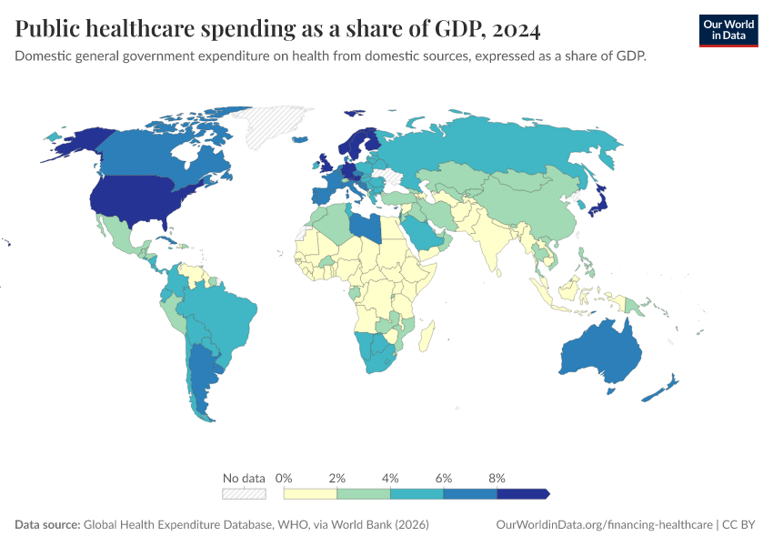“Data Page: Public healthcare spending as a share of GDP”. Our World in Data (2026). Data adapted from Global Health Expenditure Database, WHO, via World Bank. Retrieved from https://ai-search-suggested-topics-k.owid.pages.dev/grapher/public-healthcare-spending-share-gdp [online resource]How to cite this data